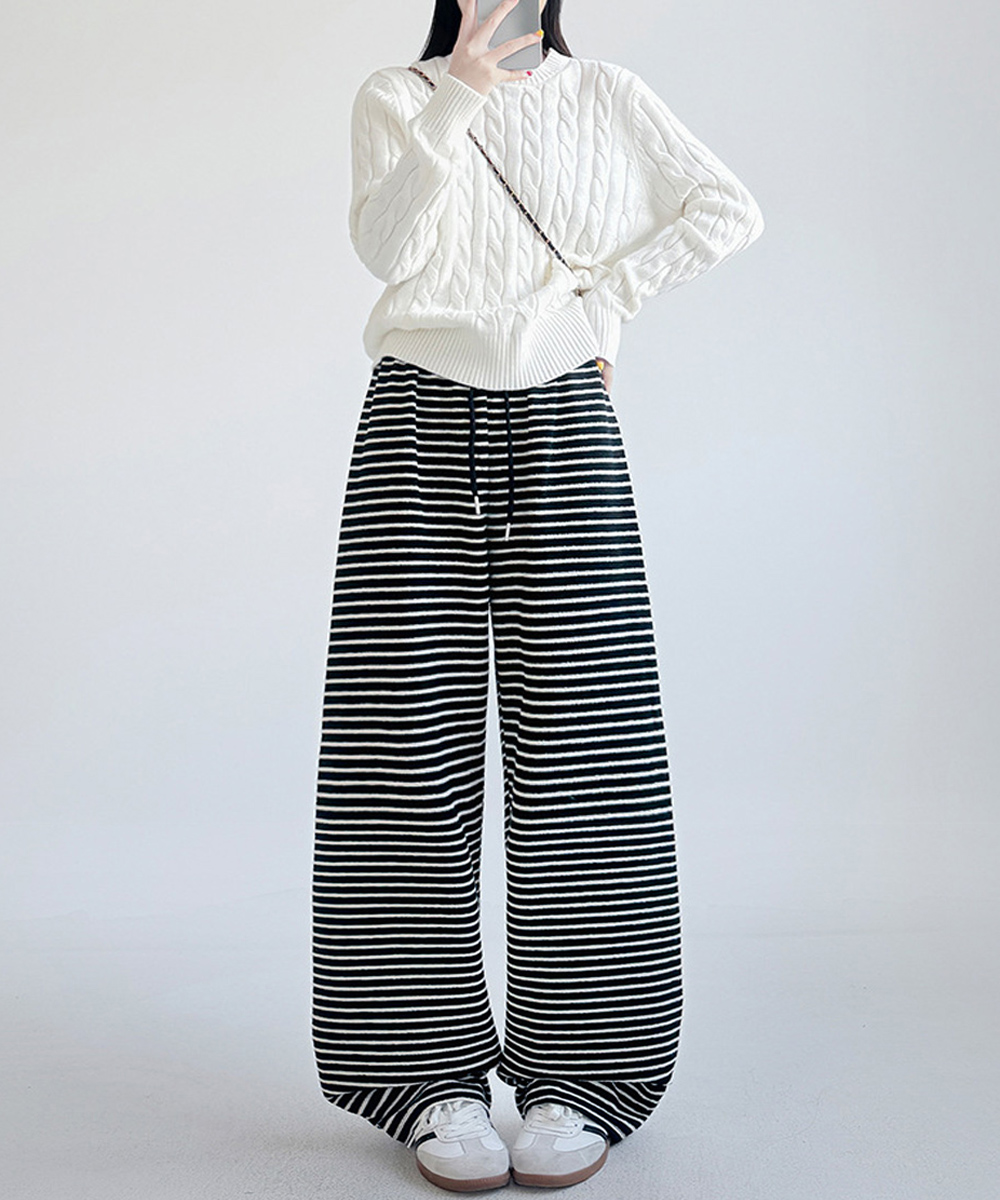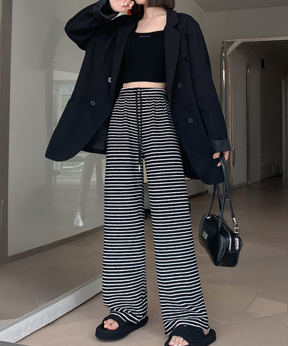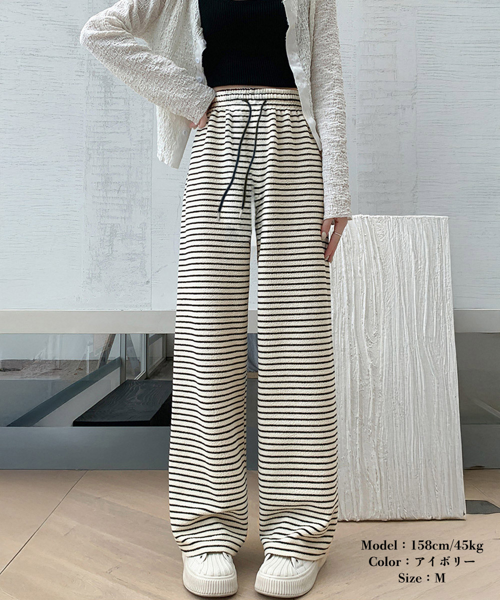 落ち感のあるワイドシルエットでリラックスした履き心地ながら脚をすっきり見せる大人可愛いボーダー柄パンツ。