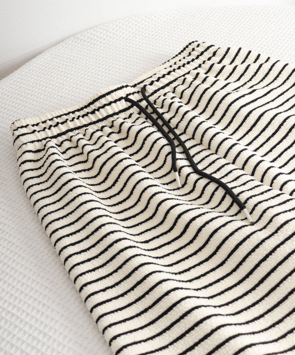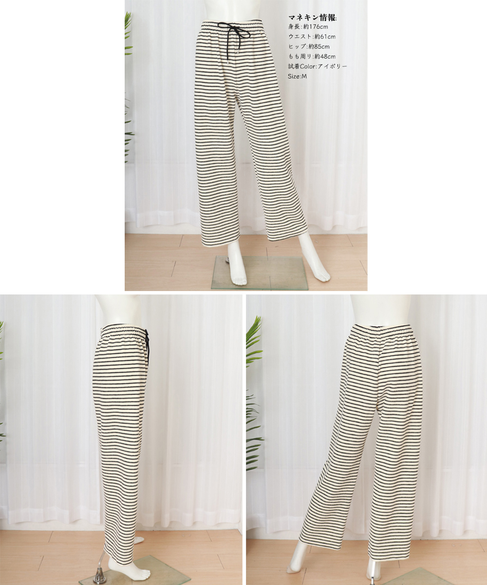 落ち感のあるワイドシルエットでリラックスした履き心地ながら脚をすっきり見せる大人可愛いボーダー柄パンツ。 レディース ルームウェアとして最適で、締め付け感のないイージー仕様でおうち時間はもちろん散歩や外出にも快適。 ナチュラルな配色でラフになりすぎず、きれいめにも着こなせる大人カジュアルなデザインです。