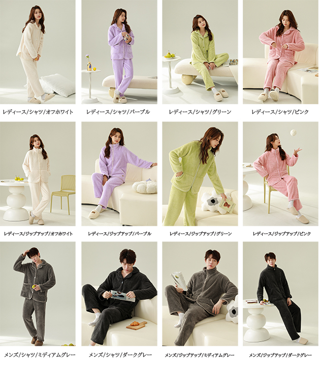 ■コメント ・暖かく包み込むような肌触りのふわもこルームウェアです。 ・静電気が起こりにくい保温性抜群の生地。 ・細かい繊維が温度を維持してくれて、保温性抜群。 ・シャツタイプとジップアップの2タイプ。 ・両サイドに大きなポケットがあり便利です。 ・ゆったり着られてリラックスできる着心地です。 ■サイズ(単位:約cm) ◆メンズ 普通(L):バスト112 着丈70.5 肩幅51.6 袖丈59.3 パンツ丈97 ヒップ105 大きめ(2XL):バスト120 着丈74.5 肩幅54.4 袖丈61.7 パンツ丈101 ヒップ113 ◆レディース 普通(M):バスト104 着丈63 肩幅45.4 袖丈56 パンツ丈94 ヒップ100 大きめ(XL):バスト112 着丈67 肩幅47.8 袖丈58 パンツ丈98 ヒップ108 ■カラー 商品画像に記載 ■伸縮性 なし ■裏地 なし ■生地の厚さ 普通 ■透け感 なし ■素材 ポリエステル100%