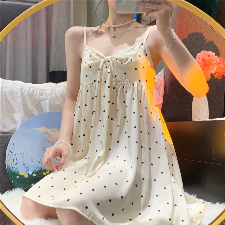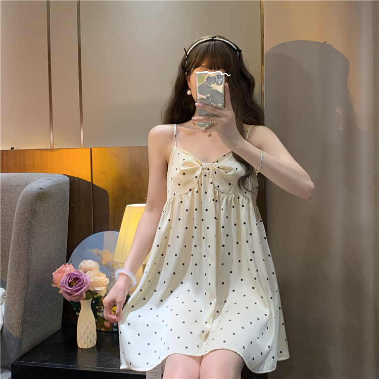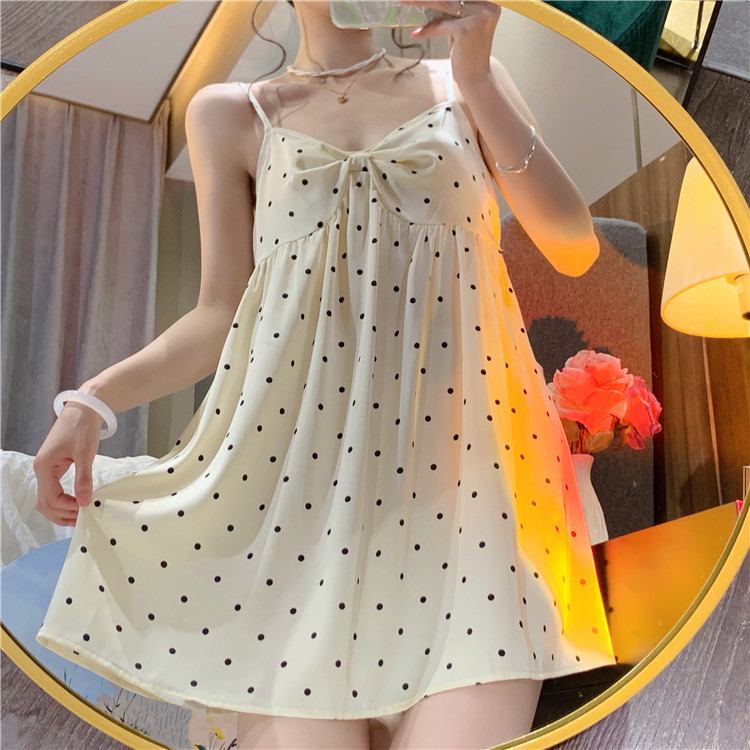キャミソール型のワンピースタイプで、胸元のリボンがフェミニンな印象を演出します。