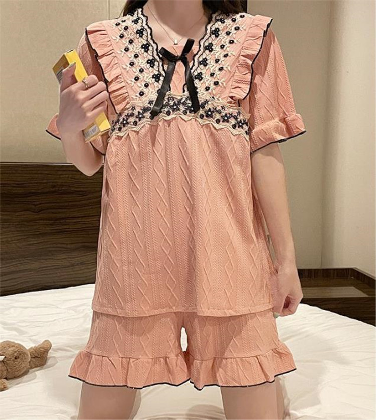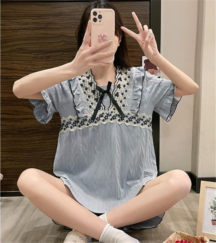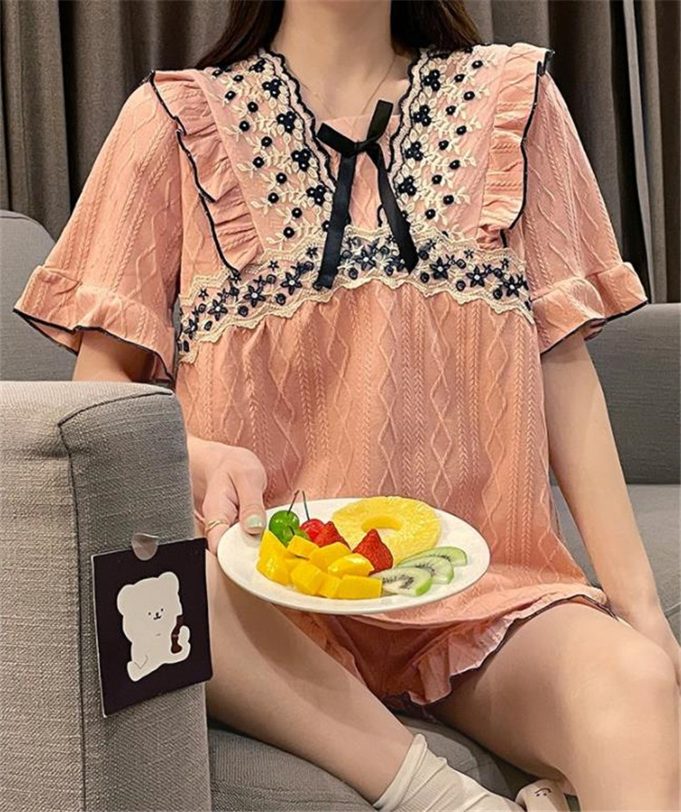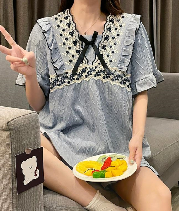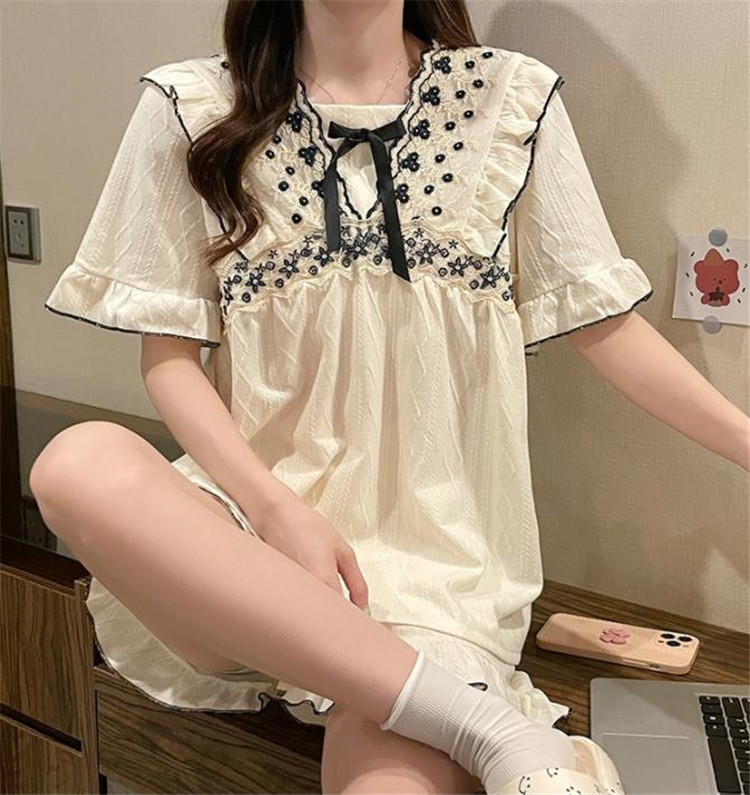 上品な花柄刺繍とフリルが可愛らしい半袖パジャマワンピースです。